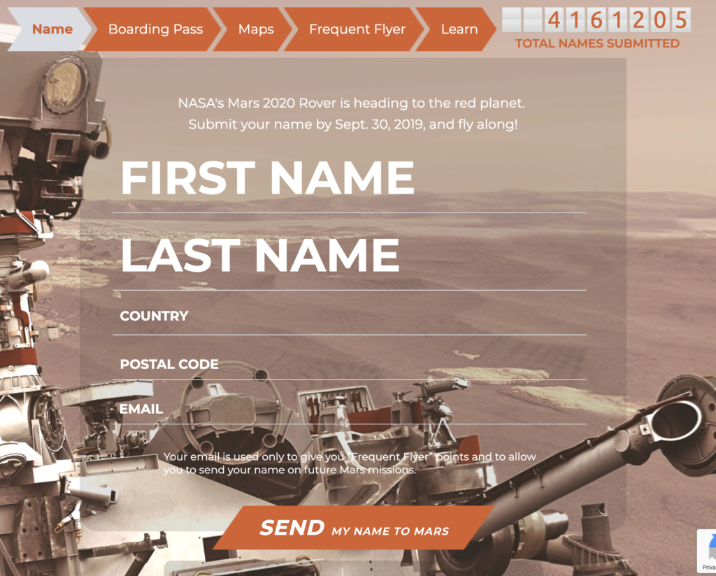 وبحسب وكالة الفضاء الأمريكية، سيتم حفر الأسماء على رقائق تنقل عبر مركبة المريخ التي سيتم إطلاقها عام 2020، وسيحصل الجمهور بذلك على بطاقة صعود تذكارية خاصة بهم.
