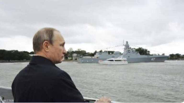 ونشر وسائل إعلام روسية صورة لبوتن وهو يعتلي الطراد الصاروخي الروسي “مارشال أوستينوف” أثناء التدريبات التي تمت في البحر الأسود.